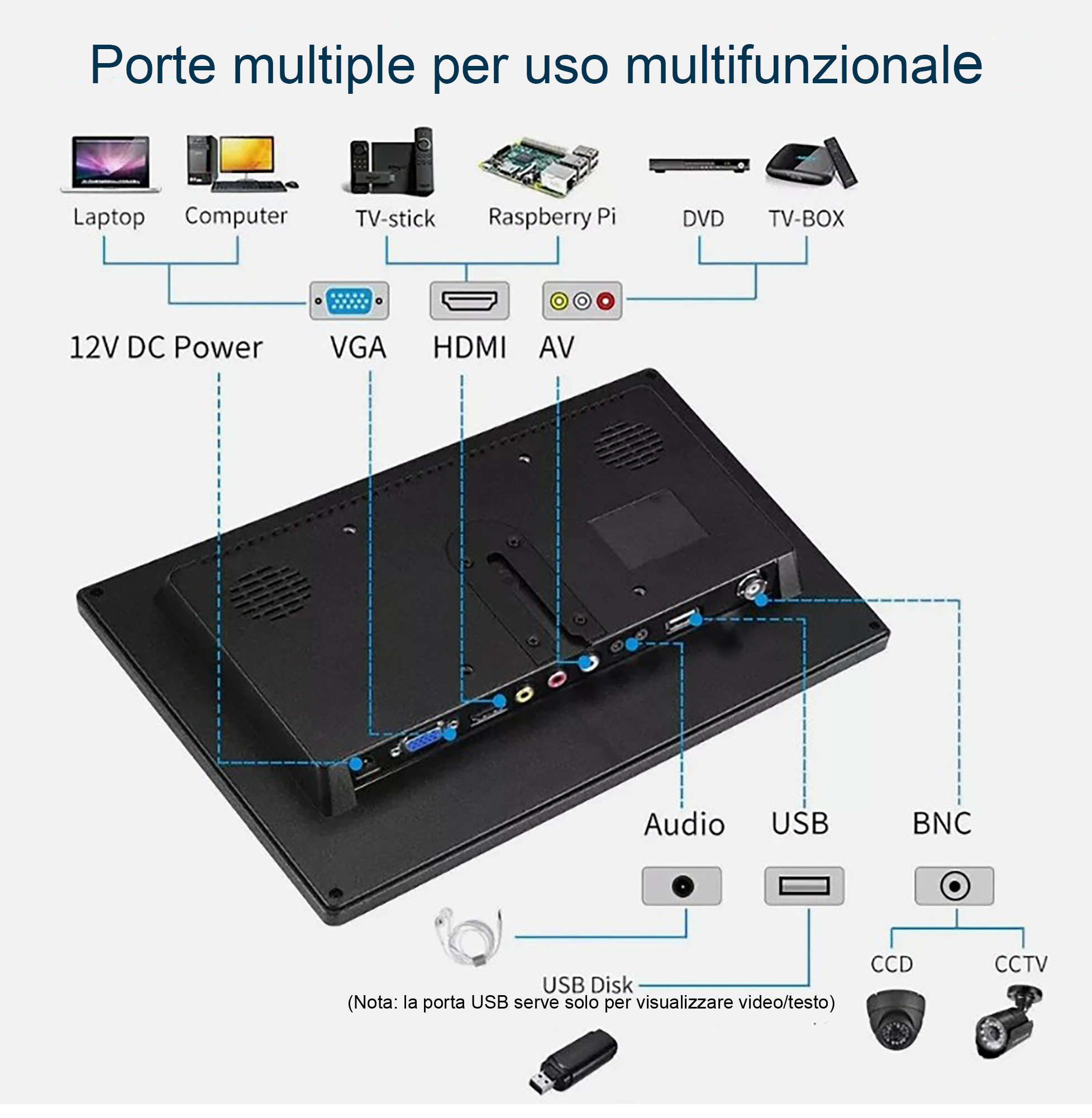 Dispone ingressi HDMI VGA BNC AV USB. Monitor Schermo: TFT/LCD 13.3 pollici